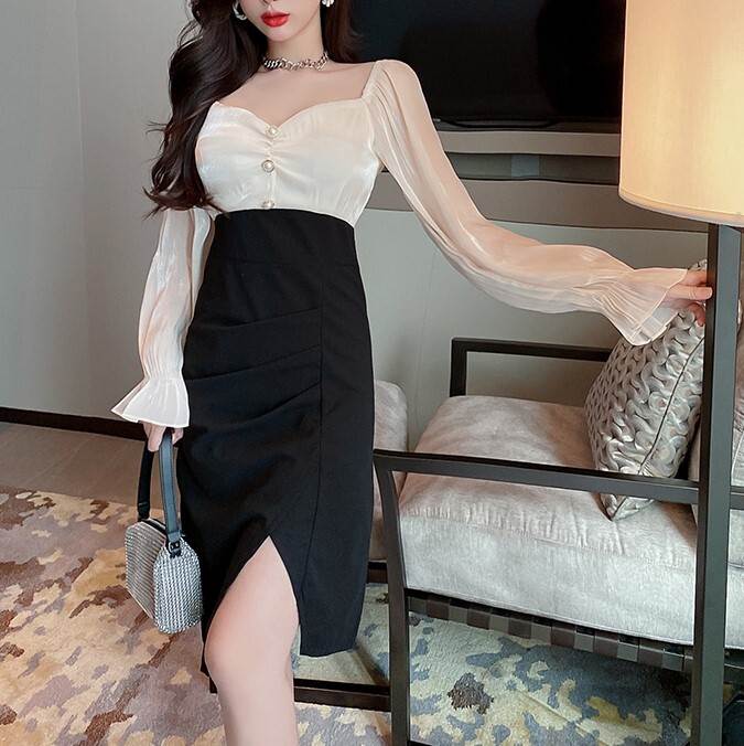 キャバ ドレス ミモレ丈 ゴージャス 黒 セクシー スレンダーライン おしゃれ 長袖 サイド キャバ嬢 スクエアネック 上品 オフショルダー ドッキング ウエスト切り替えきれ スリット