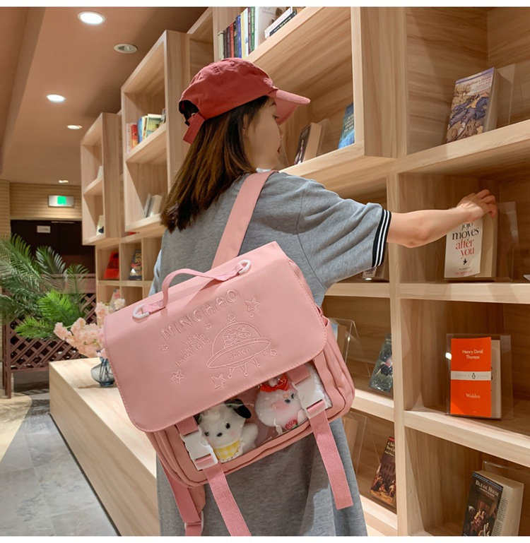 前の透明カバーに飾り板が入っていて、自分の好きな小物を入れることができるバッグです。 好きな芸能人や、アニメの写真 、缶バッジ、ストラップ、ぬいぐるみ、キーホルダーなどを入れるだけで、世界一つだけ自分のバッグです、毎日楽しく使える。