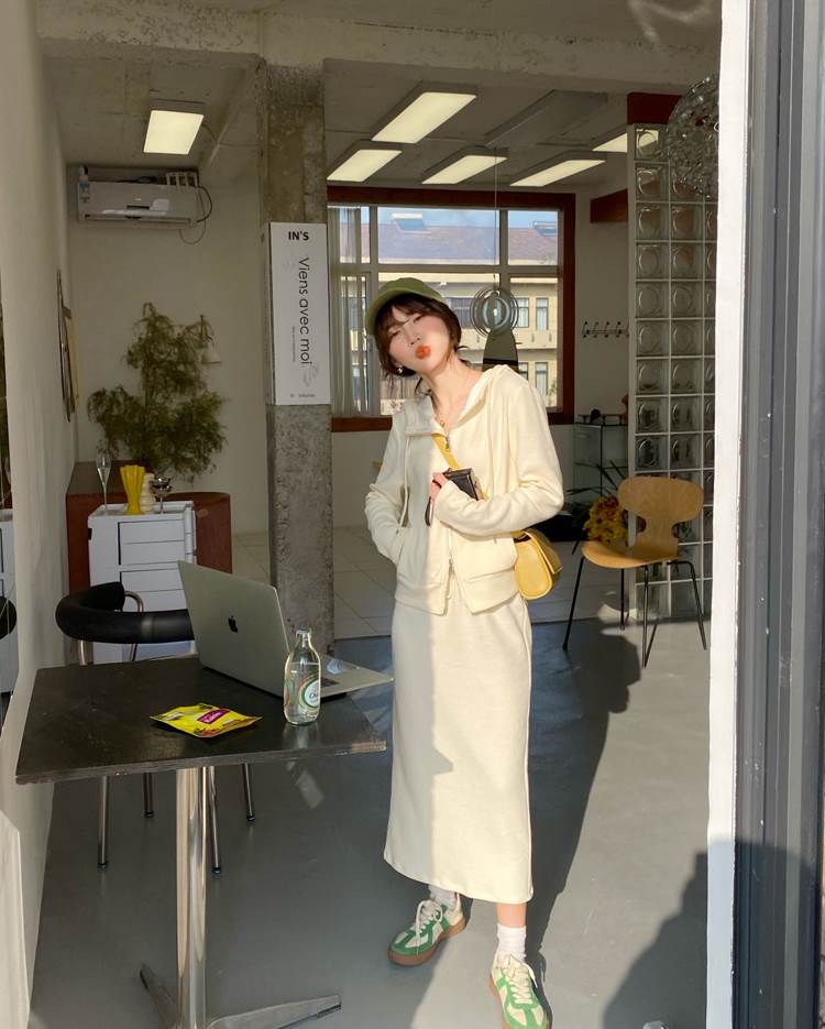 ジップタイプのパーカーとすとんと落ちるペンシルスカートが大人の抜け感を感じさせます。
