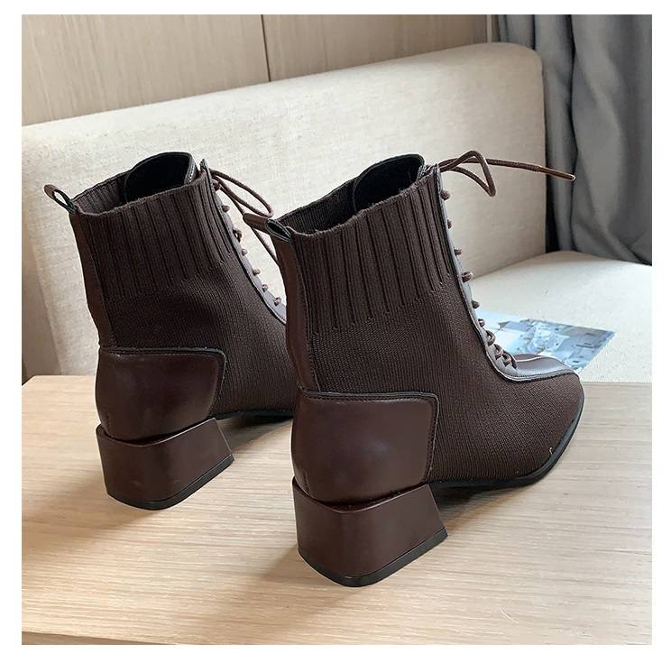 ショートブーツ レディース シューズ ブーツ 靴 レースアップ ヒール 異素材MIX 切り替え デザイン カジュアル かっこいい 大人可愛い ソックスブーツ アンクルブーツ ハイヒール スクエアトゥ