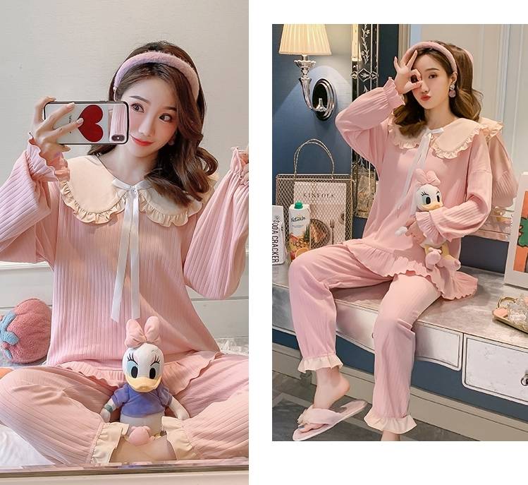 4色 パジャマ レディース 上下セット ルームウェア かわいい おしゃれ 長袖 春 秋 寝巻き 部屋着 リブ ビッグカラー リボン フリル 襟 ラブリー ガーリー xl 2xl ホームウ 大きいサイズ