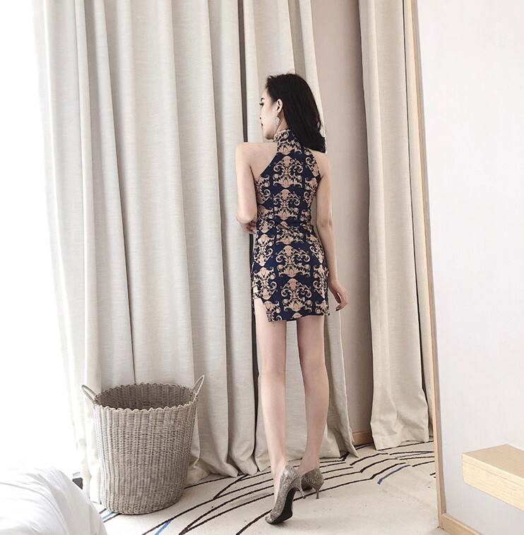 キャバ ドレス チャイナドレス レディース ミニ 超ミニ セクシー ノースリーブ オリエンタル 柄 ネイビー 金色 個性的 かっこいい クール 大人 スタンドカラー おしゃれ キャバ嬢 細身 ワンピ