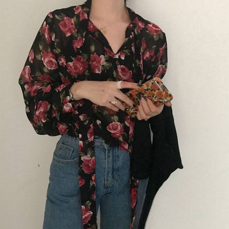ブラウス レディース トップス シャツ 花柄 レトロ 長袖 春 夏 秋 10代 20代 30代 40代 プルオーバー Vネック フラワー 柄 ボリューム袖 ボウタイ リボン ブラック 黒 ア シフォン