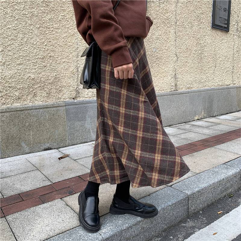 チェックスカート ロングスカート フレアスカート スカート ボトムス レディース 秋冬 ハイウエスト Aライン ロング ミモレ丈 格子縞 チェック柄 ブラウン フレア カジュアル レトロ 可 きれいめ
