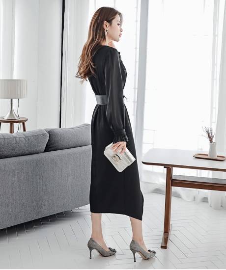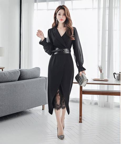 袖の透け感とスカートから覗くレースが大人っぽい、ブラックドレスです。