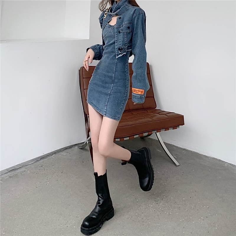 セットアップ デニム Gジャン ワンピ ジャケット ワンピース 2点セット 長袖 ショート丈 ボディコン スリム 青 ブルー 襟付き 個性的 大人可愛い かっこいい おしゃれ S M インス こなれ感