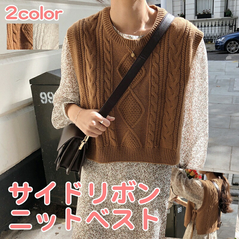 \売れてます/ ベスト ニット ケーブル 編み込み サイドリボン かわいい カジュアル ガーリー ベージュ 茶色 ブラウン ニットベスト トップス レトロ 韓国 お揃い 双子